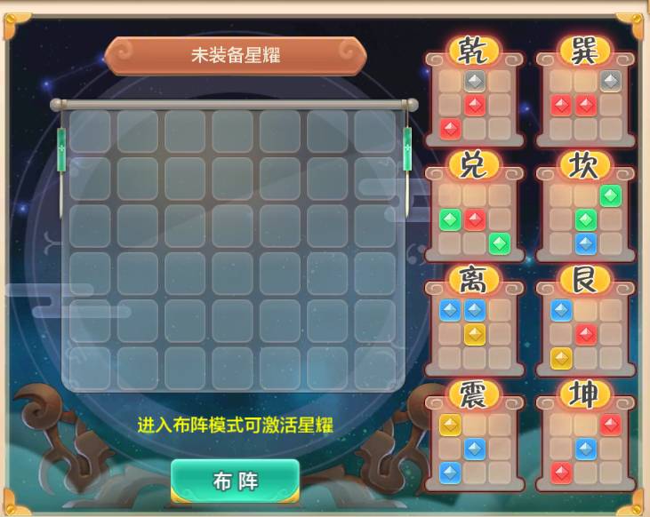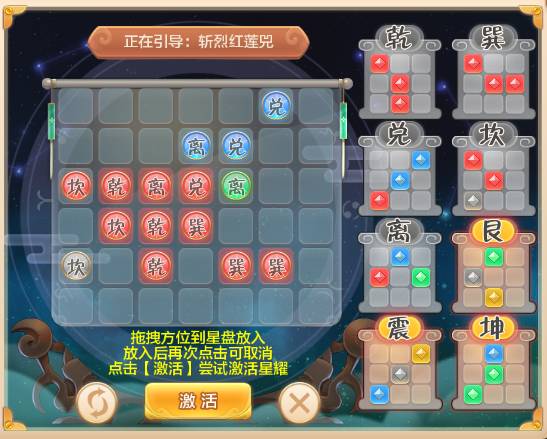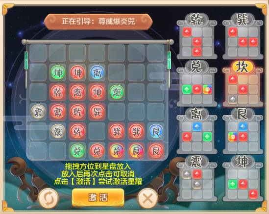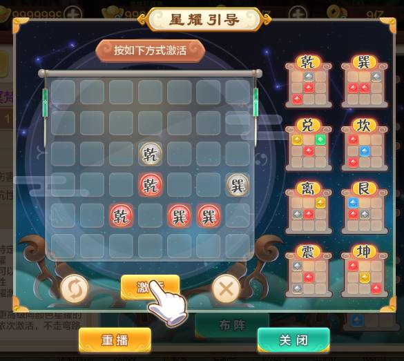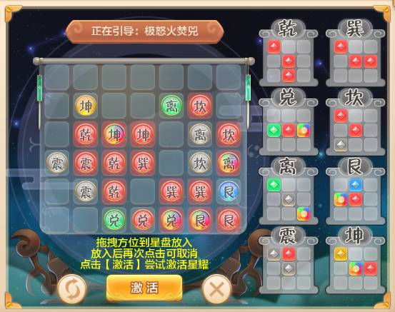 星耀界面右下角有一个手型图标,打开是引导您如何激活星耀的,看上图,可以了解,想激活星耀,只要特定位置摆放上特色颜色的球即可,比如【乾】是有两个纯色和一个灰色的,【巽】也是这样。这就是如何用杂色的形式激活星耀了。